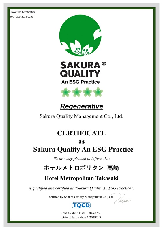 この度、SDGsを実践する宿泊施設の国際認証「Sakura Quality An ESG Practice(通称:サクラクオリティグリーン)」の