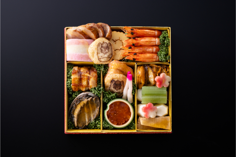 蝦夷鮑/海老艶煮/紅白蒲鉾/合鴨スモーク/伊達巻/鶏八幡巻/鮭西京焼/イクラ醤油漬け/焼帆立照煮/里芋含ませ/竹の子含ませ/蕗含ませ/梅麩/薩摩揚げ/はじかみ
