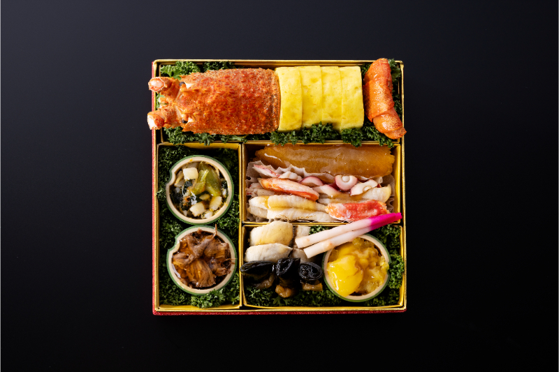 イセエビ真丈焼き/つぶ貝黄金和え/牛肉時雨煮/数の子醤油漬け/棒カニ/白河豚南蛮漬け/蛸 白だし洗い/狭腰柚庵焼き/栗金団/一口昆布巻/はじかみ/梅麩